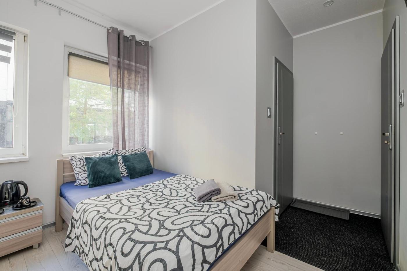 Pokój Dwuosobowy ze wspólną łazienką. The double room features a shared bathroom equipped with a shower and a hairdryer. Guests can make meals in the kitchenette that is equipped with a stovetop, a refrigerator, a dishwasher and kitchenware. The double room provides a flat-screen TV with cable channels, a wardrobe, an electric kettle, heating as well as city views. The unit offers 1 bed. Pokój Dwuosobowy - 2 osobowy. Powierzchnia pokoju ok.: 12 mkw. ;