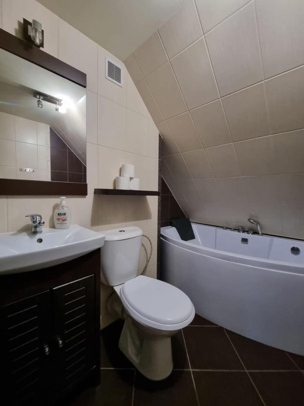 Domek. The hot tub and fireplace are the special features of this chalet. This spacious chalet comes with 1 living room, 4 separate bedrooms and 2 bathrooms with a walk-in shower and a bath. Guests will find a refrigerator, a dishwasher, kitchenware and an oven in the well-fitted kitchen. The chalet also includes a barbecue. The chalet has parquet floors, a seating area with a flat-screen TV, a washing machine, a tea and coffee maker as well as garden views. The unit has 5 beds. Domek - 8 osobowy. Powierzchnia pokoju ok.: 140 mkw.