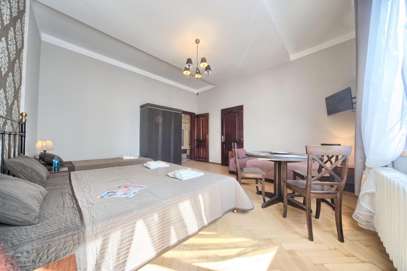 Pokój Trzyosobowy typu Deluxe. Providing free toiletries, this triple room includes a private bathroom with a shower and a hairdryer. The triple room provides a flat-screen TV, a tea and coffee maker, a wardrobe, parquet floors as well as city views. The unit offers 3 beds. Pokój Trzyosobowy - 3 osobowy. Powierzchnia pokoju ok.: 16 mkw. ;