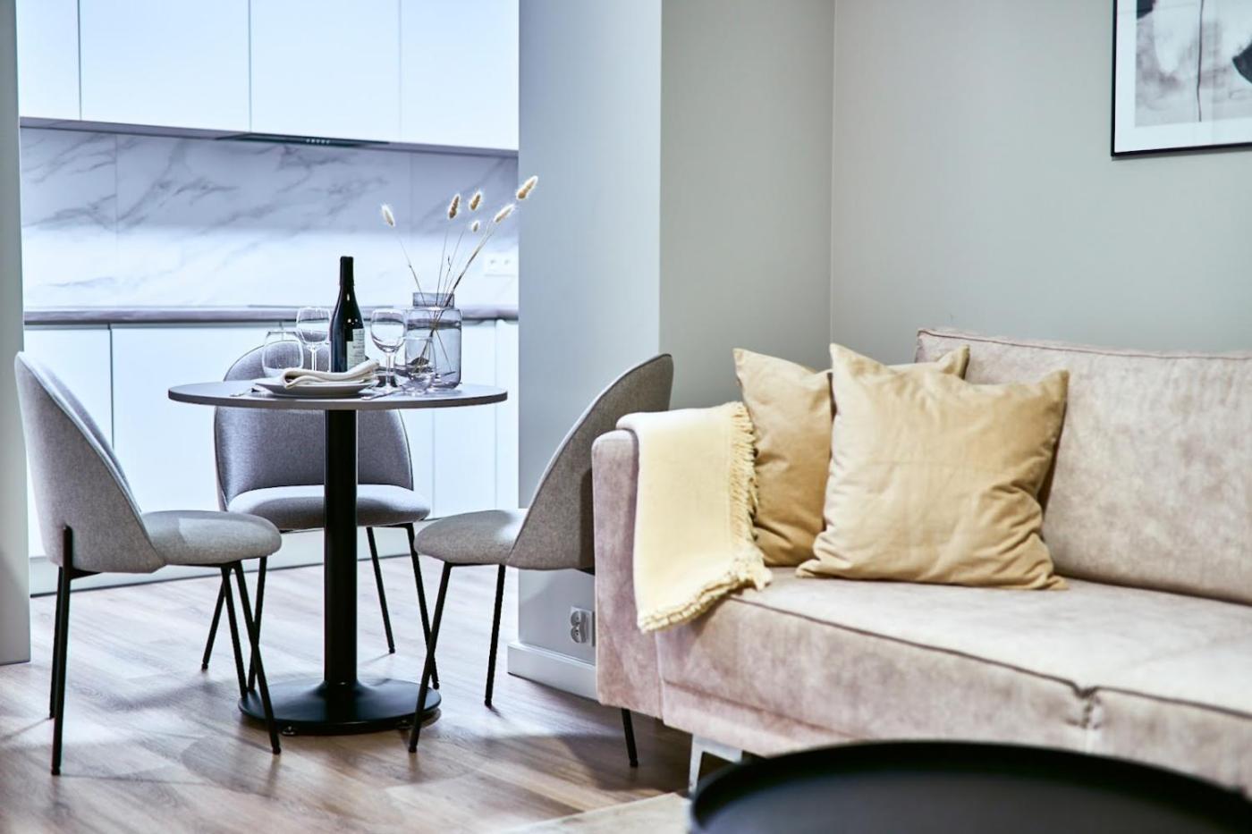 Oferta apartamentu obejmuje sypialnię (1), salon, aneks kuchenny z pełnym wyposażeniem, w tym lodówką i ekspresem do kawy, a także łazienkę (1) z prysznicem oraz bezpłatnym zestawem kosmetyków. W apartamencie zapewniono ręczniki i pościel.
